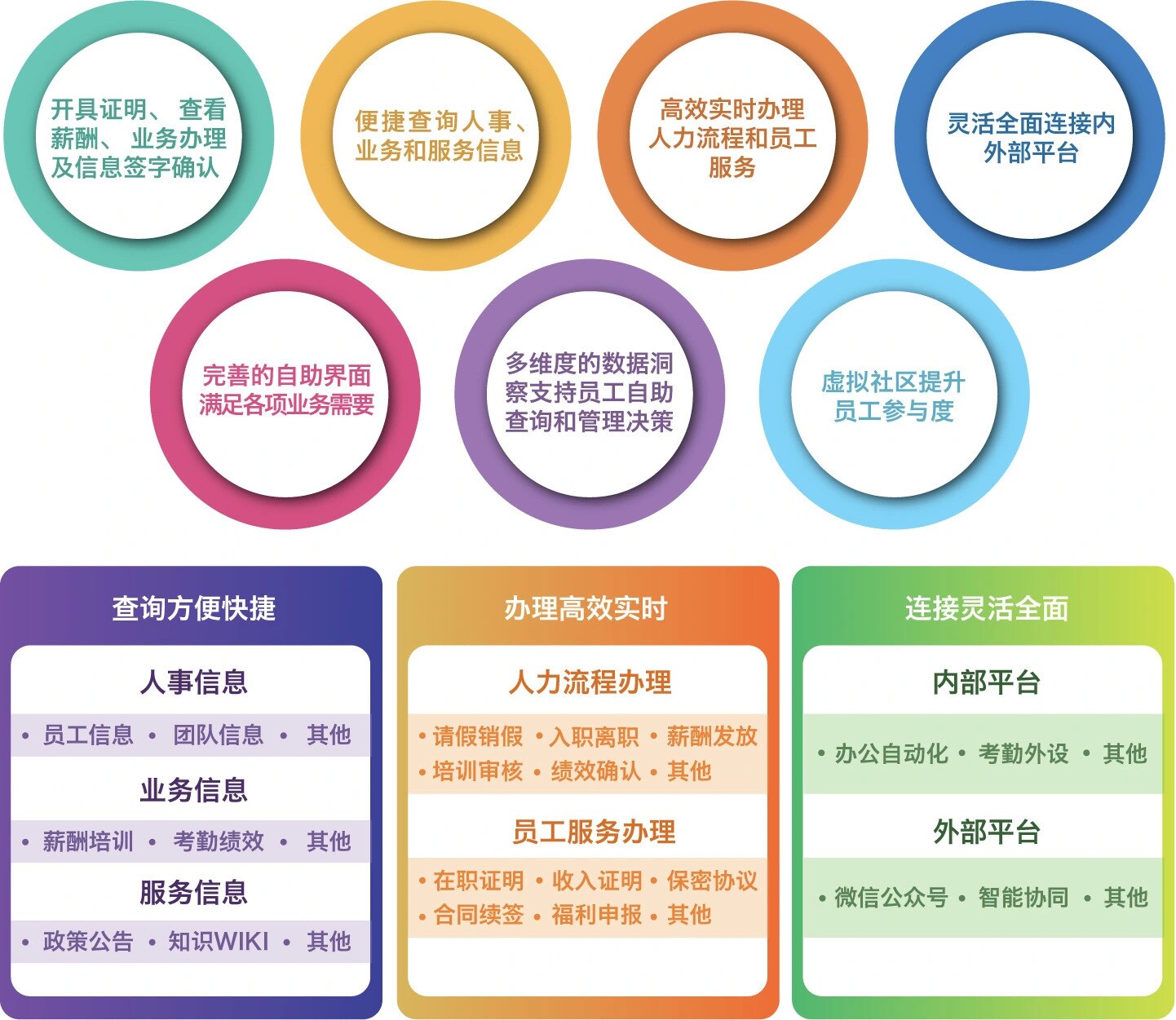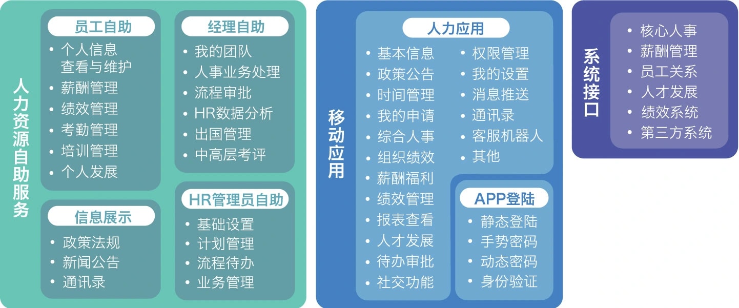 自助服务和移动应用平台集成了PC端、移动端APP以及系统接口。PC端全面展示人力资源平台界面,提高应用性能;APP提供简易便捷的操作体验,着重用户体验及用户习惯;系统接口实现与核心人事及外部系统间数据贯穿与传递,为企业提供人力资源业务的全流程管理,以及支撑重大常态化数据分析。
