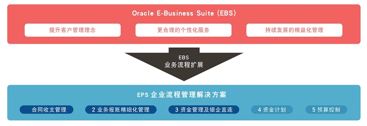 企业流程管理解决方案(Enterprise Process Solutions,简称EPS)是联想电讯盈科企业方案基于 Oracle EBS 研发的企业业务流程扩展应用。在 Oracle EBS 满足企业日常业务和管理的要求基础之上,EPS在合同管理,业务报账,资金管理,预算控制,银企直连等深化应用上,实现了对 Oracle ERP 的有益补充和提升。EPS 还支持 IOS、Android 等智能移动端访问,使企业的信息化应用场景得到完善和扩展,适应云计算时代信息化商业模式的创新变革。